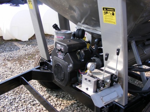 SKID-FORKLIFT, ADAMS 240T SKID TENDER WITH 240 CUBIC FT. STRUCK CAPACITY, 304 STAINLESS STEEL WITH MILD STEEL SUPPORT SKIDS FOR EASE OF MOUNTING, SRT II ROLL TARP, HYDRAULIC FOLD 8” DISCHARGE AUGER, 9’ OF UPPER TUBE LENGTH, STAINLESS STEEL AUGERS, HYDRAULIC DRIVE, ALL STAINLESS STEEL MANUAL SLIDE HOPPER DOOR AND CLEAN OUT GATE, 20 HP KOHLER ENGINE