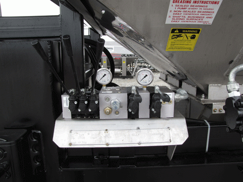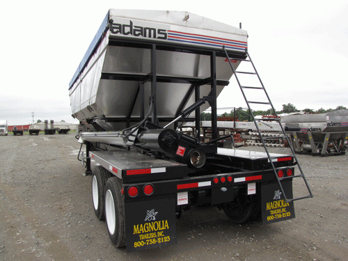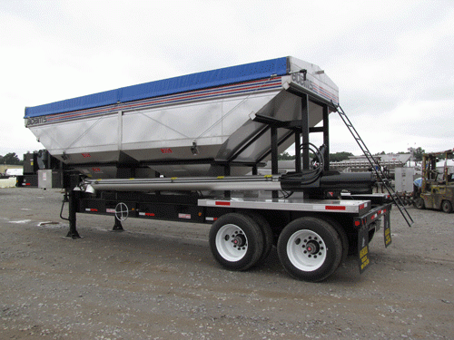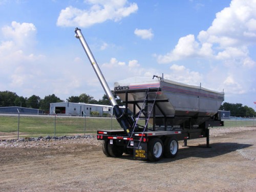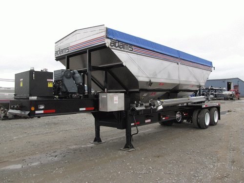 ADAMS 870 CUBIC FT. 304 STAINLESS STEEL HEIGHT ADJUSTABLE SIDE DISCHARGE TRAILER TENDER, (2) COMPARTMENT, SAFETY PORTS, 2-PIECE 9” X 19’ MILD STEEL BELLY AUGER, 1-PIECE 9” X 19’ MILD STEEL DISCHARGE AUGER, 10” STAINLESS STEEL AUGER PIPES, 45 HP AIR COOLED DEUTZ ENGINE WITH TANDEM HYDRAULIC PUMP HYDRAULIC DRIVE AUGER, HYDRAULIC FOLD, HYDRAULIC HOPPER DOORS, HYDRAULIC DUMP DOOR, LARGE HYDRAULIC TANK WITH SIGHT GAUGE, STAINLESS STEEL FUEL TANK, REMOTE GREASE TUBES, SRT II ROLL OVER TARP.